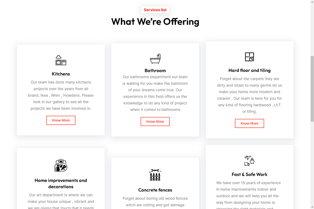A separate page is needed for each and all offers and things the firm can do. And all must have an icon and some little explanation. After the explanation, a button with know more is activated and a new page with more details pop up.